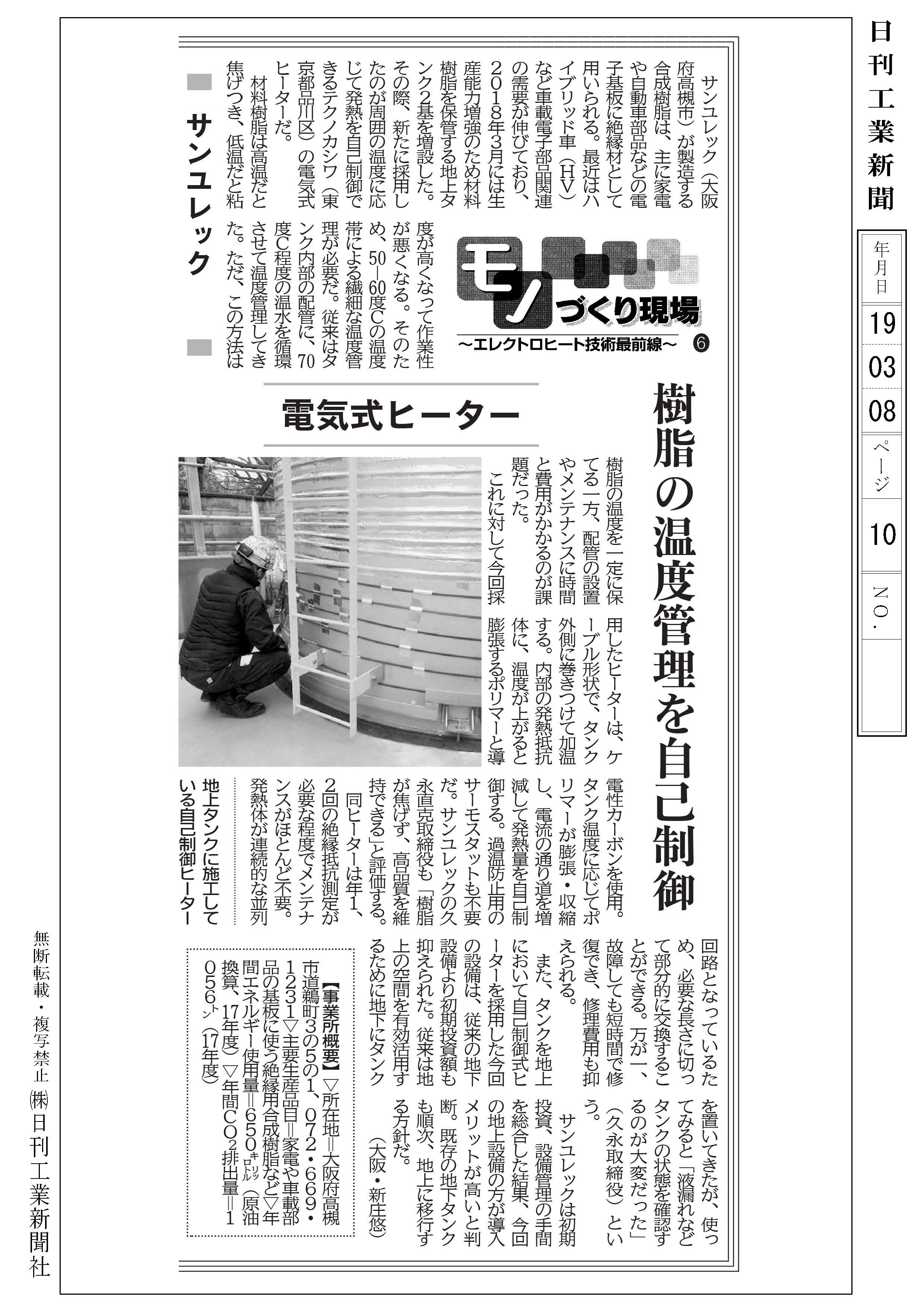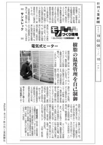 2019年3月8日付日刊工業新聞 の「モノづくり現場 エレクトロヒート技術最前線~6」に、弊社製品の導入事例記事が掲載されました。